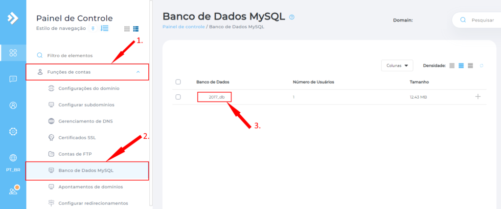 No painel do DirectAdmin, localize e clique na opção “Bancos de Dados MySQL” (MySQL Management) na secção “Funções de contas” (Account Manager) para acessar o gerenciador do MySQL. Em seguida, localize e clique no banco de dados ao qual deseja autorizar o endereço IP.