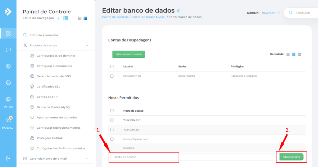Na seção “Hosts Permitidos” (Access Hosts) do gerenciador do MySQL, localize o campo “Hosts de acesso” (Access Host) e adicione o endereço IP que deseja autorizar. Certifique-se de adicionar o endereço IP correto e clique em “Adicionar novo” (Add New).